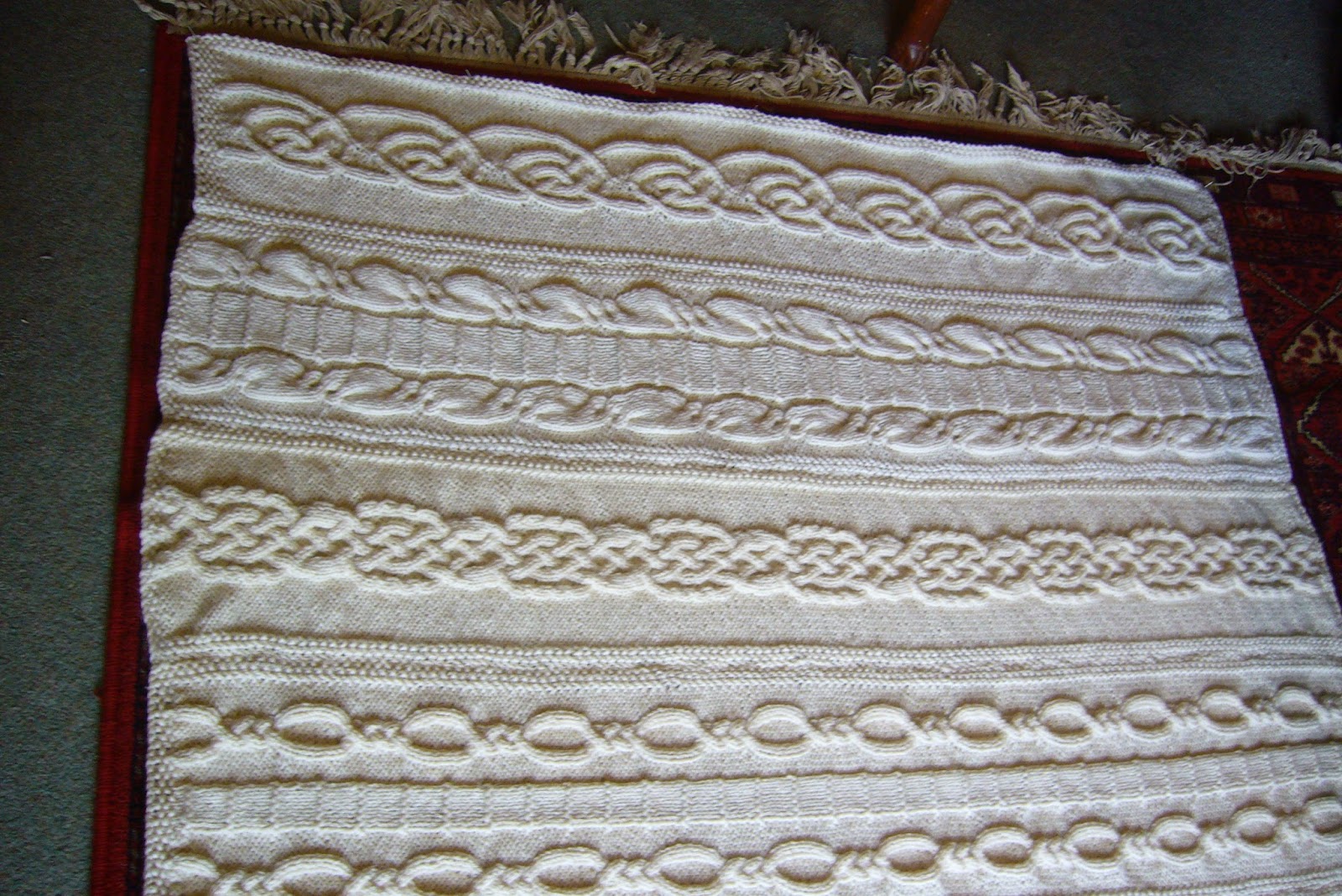 I picked up stitches at each end and knitted to match the length, and then picked up the edges and knit outwards for two and a half inches to fit the width. With the cabling centred like this it looks like a fragment of masonry, as in the Viking crosses.